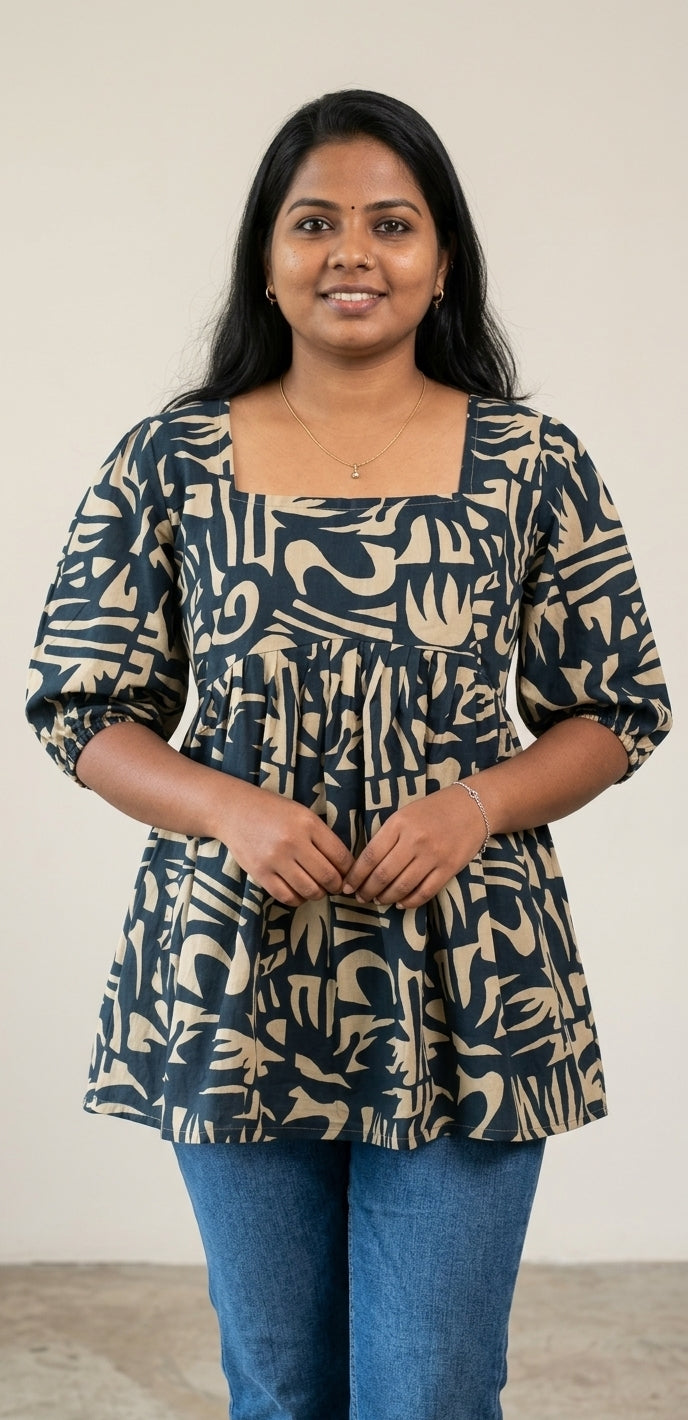 Step into effortless style with this elegant black and beige printed short kurti. Designed with a modern abstract print and a flattering gathered waist silhouette, this kurti offers both comfort and fashion for everyday wear.