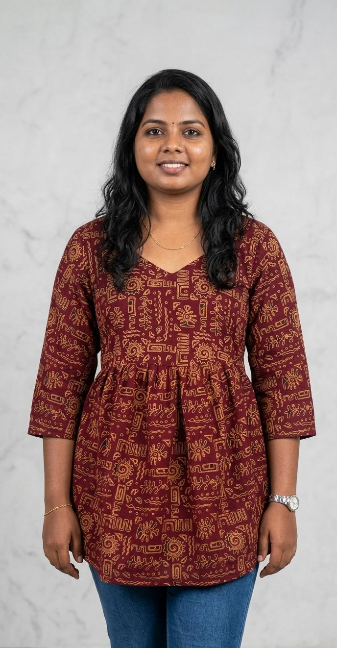 Add a touch of elegance to your wardrobe with this beautiful maroon printed short kurti. Designed for both comfort and style, this kurti features a modern ethnic print and a flattering fit that makes it perfect for everyday wear. The soft fabric ensures all-day comfort while keeping you stylish.